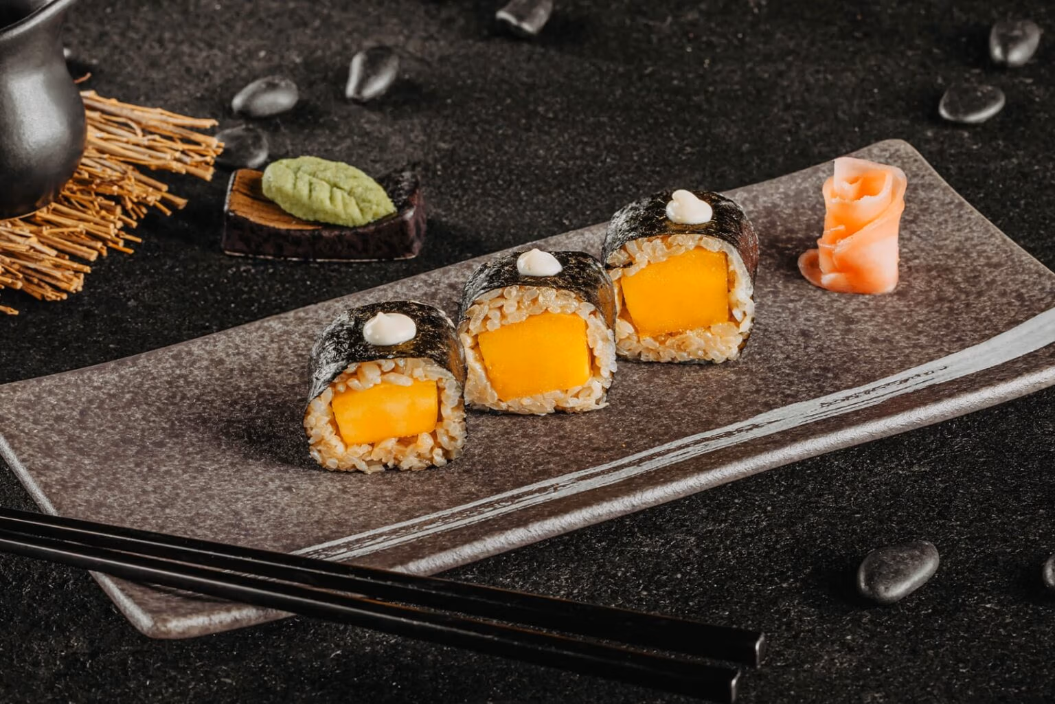 Mango, omelet, cream cheese, melon, mixed sesame, spicy mayo, salmon eggs (3 pcs) 249 ฿