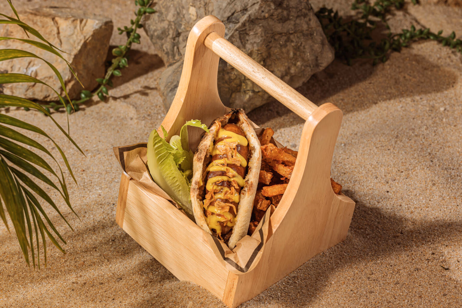 Small roll, grilled chorizo, smoky sauce, fries.