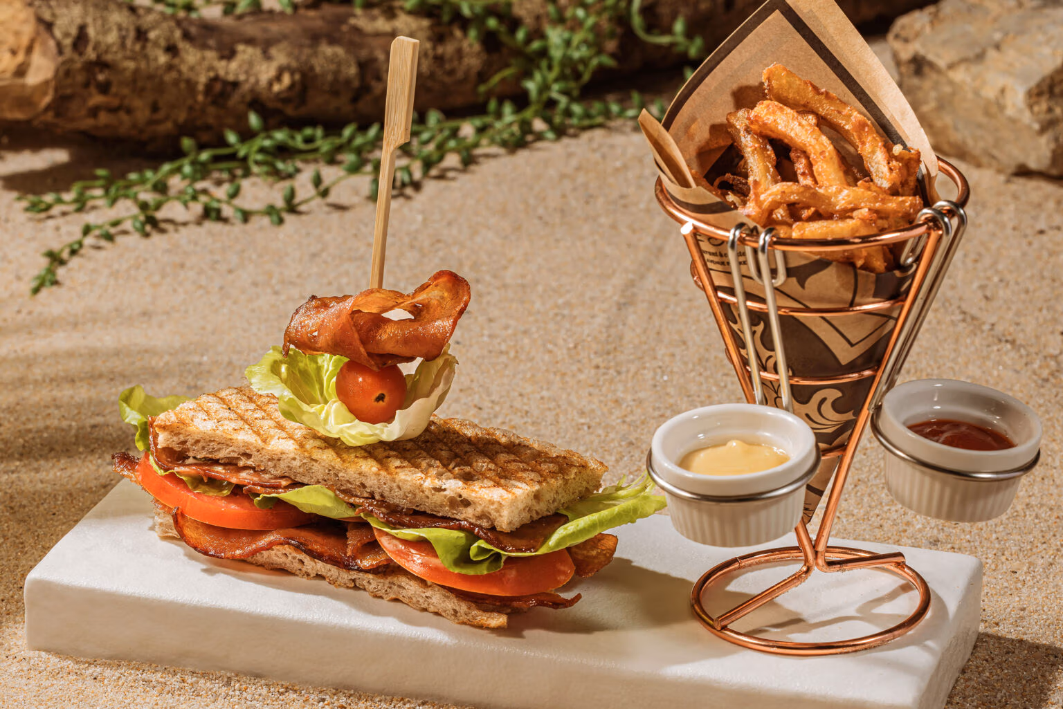 A classic sandwich where crispy bacon meets the freshness of lettuce and tomatoes. Mayonnaise adds a creamy touch, making every bite irresistible. Served with French fries. 599 ฿