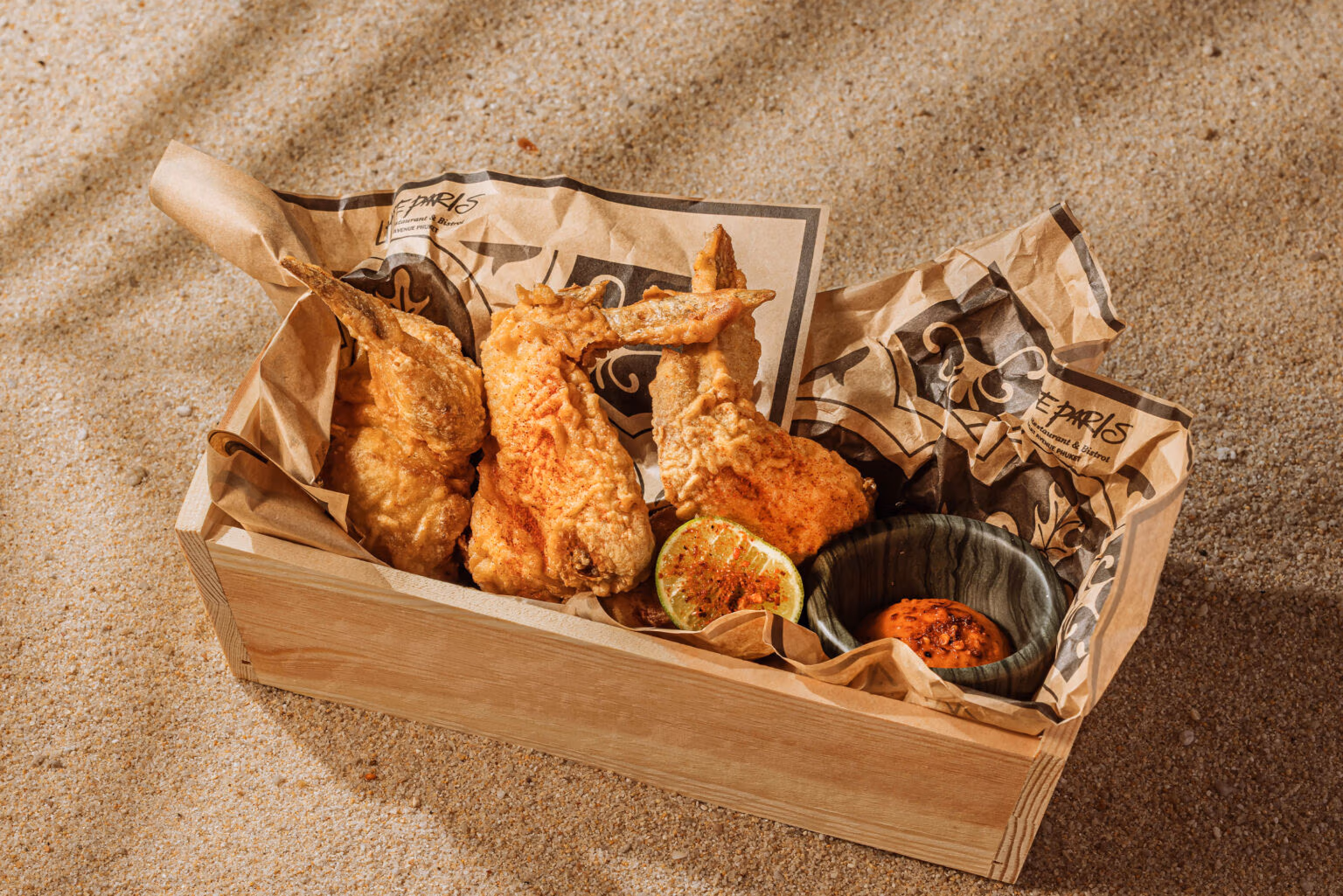 Crispy golden chicken wings served with a lightly sweet and spicy sauce, accented with fresh lime. 549 ฿