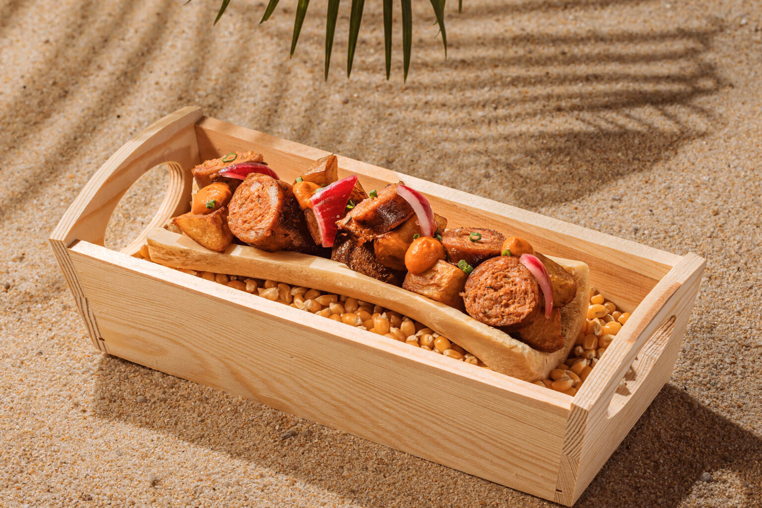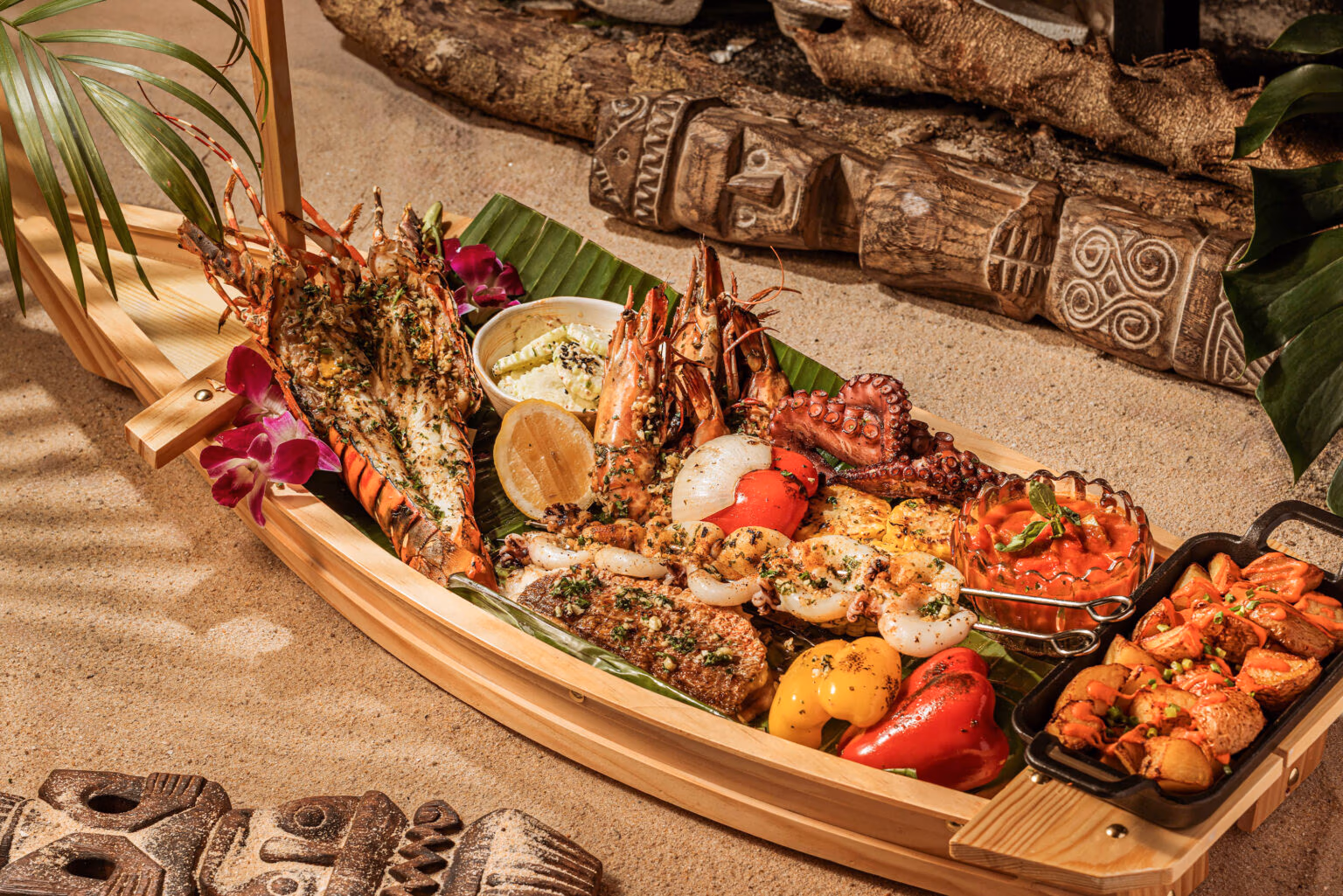 Japanese barbecue-roasted Australian Black Angus tomahawk, exceptionally tender and flavorful. Served with sweet chili-grilled corn, crispy patatas bravas, Mediterranean ratatouille, fresh romaine heart, Caesar sauce, lightly spiced Béarnaise, and aromatic chimichurri. 6999฿