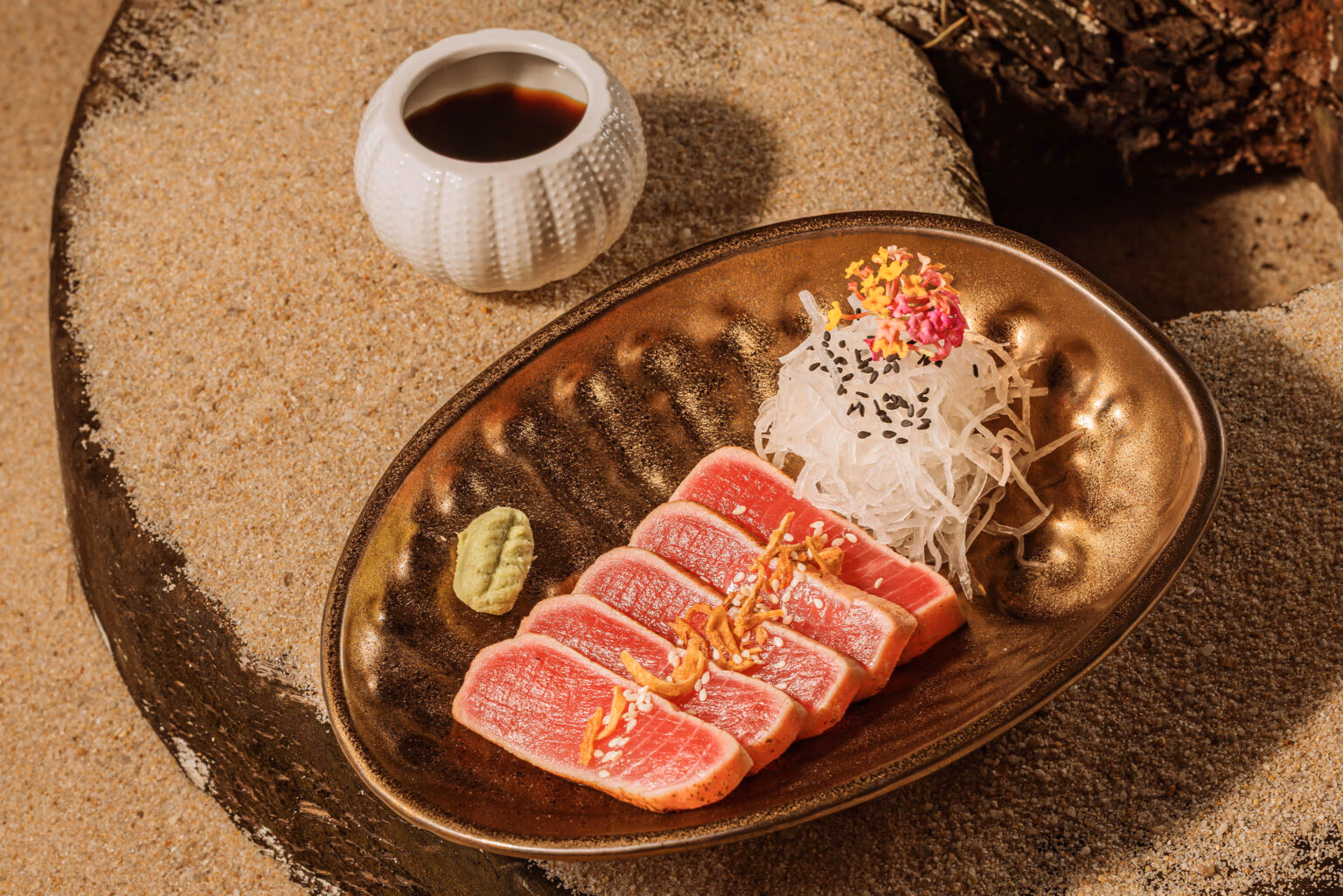 Lightly seared red tuna served with crisp daikon radish, fresh wasabi, and a zesty ponzu sauce.