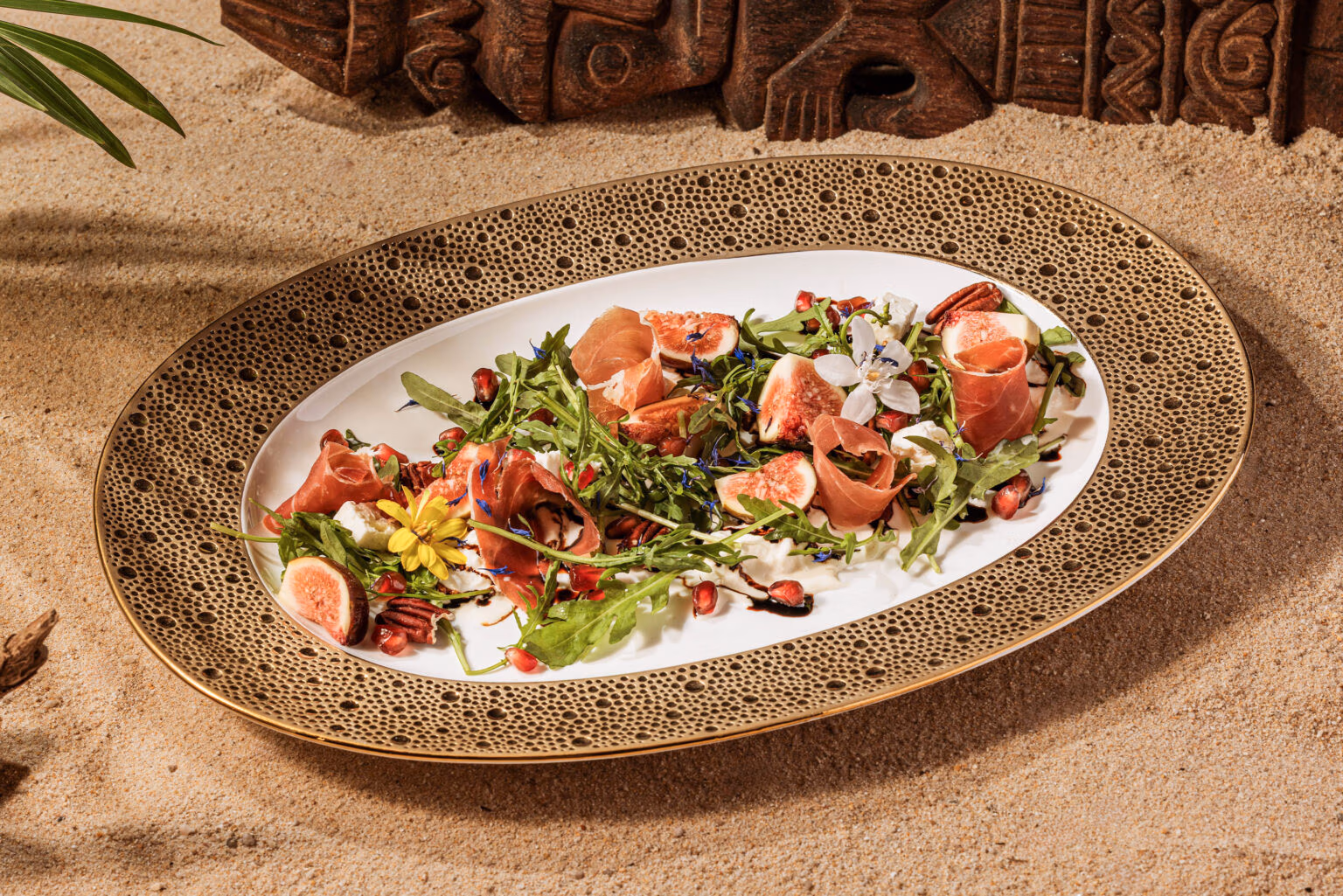 Fresh fig salad with stracciatella, feta cheese, speck ham, rocket, pomegranate, and pecan nuts.