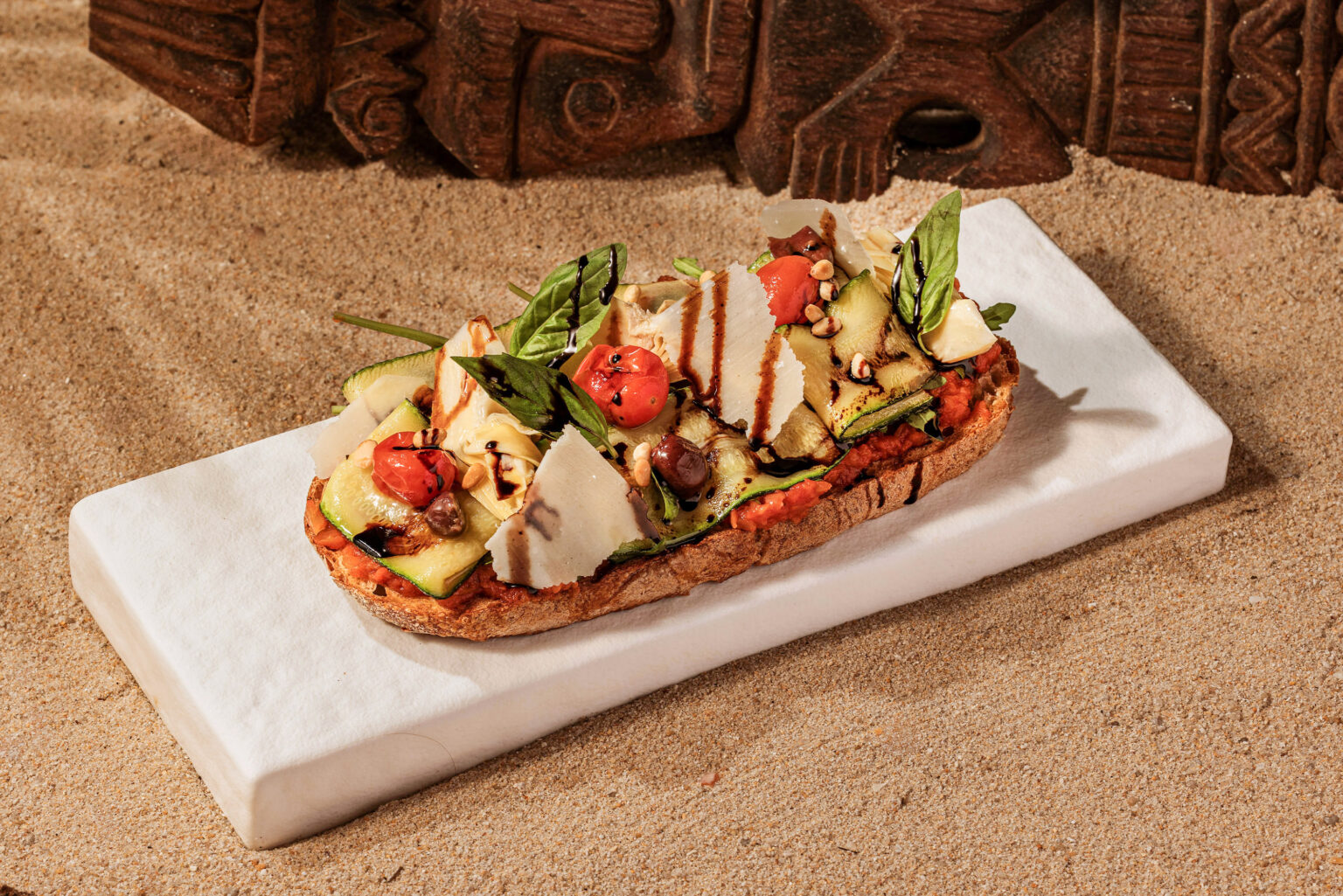 A toast topped with artichoke, sundried tomatoes, Taggiasca olives, Parmesan, pine nuts, zucchini, rocket, and tomato concassé. 699 ฿