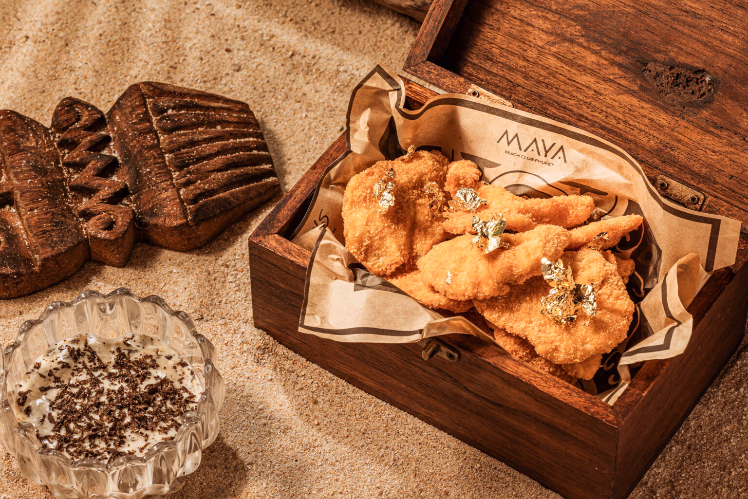 Five crispy shrimp chips, delicately seasoned with Maya’s signature spices.