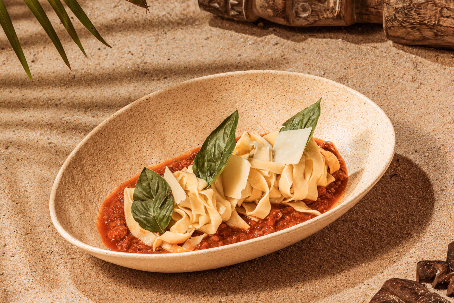 Al dente tagliatelle served with a rich Bolognese sauce made from simmered beef and flavorful tomatoes.